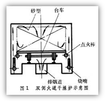 2005年在沈阳金龟减速机厂,国内首次改造传统的燃煤沙型干燥窑,以型煤做为燃料,采用半煤气化燃烧方式成功解决了煤室的污染问题,各项排放招标达到环保要求,并且与燃煤窑相比节能50%以上,成为沈阳市节能环保示范项目。 砂型干燥窑是对铸造用的砂型或型芯进行加热,使其所含水分汽化、蒸发以达到干燥目的的工业炉。砂型或型芯中的有机物,如木屑等,也在加热过程中被烧去,从而使砂型的透气性增加。型芯中的一些粘接剂,如油类和沥青等,经过加热才具有粘接能力,从而使型芯的强度增加。 干燥温度取决于砂型或型芯的物料组成,砂型的干燥温度为400~500℃,型芯的干燥温度为200~350℃。这种炉子多为火焰炉,要求炉内有良好的气流循环条件。炉室宽度大于2米时两侧应设火道,中间设排烟道(图1)。炉室宽度小于2米时可一侧设火道,另一侧设排烟道(图2)。砂型和型芯干燥炉一般做成带有炉门的室状炉膛。砂型或型芯装在台车上,沿轨道送入炉内加热(干燥)。砂型在炉内的干燥时间,依装载量多少、砂型大小和物料组成情况而定。当砂型或型芯的品种同一、批量很大时,则采用连续式干燥炉,用输送链条或活动小车将砂型或型芯连续地通过划分有温度区段的炉内进行干燥,这种炉型的干燥效率高。