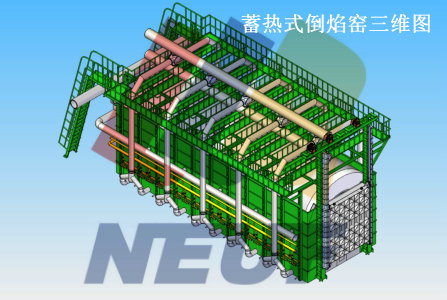 - 蓄热式倒焰窑采用内置式蓄热式燃烧方式,喷嘴沿炉长方向均匀密布,结合传统倒焰窑的气流方式,使窑内各向温度分布更加均匀。倒焰窑排烟温度≤150℃,空气预热温度≥1200℃,制品最终单耗≤75m3天然气/吨。蓄热式倒焰窑的原理如图所示。