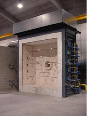 燃烧炉直立位置,炉壁左右两边各有6个燃烧嘴。燃烧嘴使用液化石油气。配备所有火焰安全系统,间断引燃系统以及温度感应器。