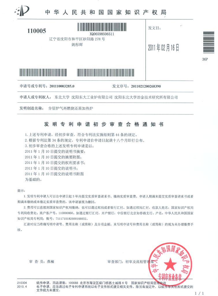 近日,公司最近一段时间的四项研究新成果:“加热炉余热回收发电装置”(申请号:201110003306.9),“分层炉气再燃烧还原加热炉””(申请号:201110003285.0),“电熔镁熔砣余热回收利用技术及装置””(申请号:201110003308.8),“油母页岩干湿混合法干馏工艺及蓄热式外燃干馏炉””(申请号:201110003281.2)已经呈报至国家知识产权局沈阳代办处,经国家知识产权局审查,四项发明专利初步审查全部合格。如果这几项专利申请成功,公司将成功转型为科技型企业。