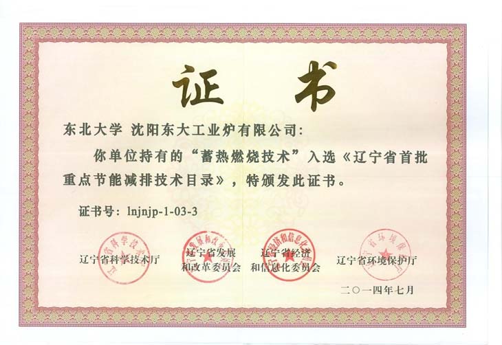 近日公司持有的“蓄热燃烧技术”被辽宁省科学技术厅、辽宁省发展和改革委员会、辽宁省经济和信息化委员