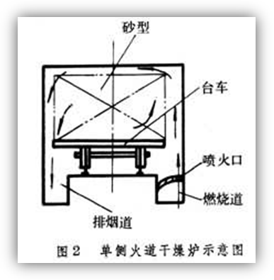 2005年在沈阳金龟减速机厂,国内首次改造传统的燃煤沙型干燥窑,以型煤做为燃料,采用半煤气化燃烧方式成功解决了煤室的污染问题,各项排放招标达到环保要求,并且与燃煤窑相比节能50%以上,成为沈阳市节能环保示范项目。 砂型干燥窑是对铸造用的砂型或型芯进行加热,使其所含水分汽化、蒸发以达到干燥目的的工业炉。砂型或型芯中的有机物,如木屑等,也在加热过程中被烧去,从而使砂型的透气性增加。型芯中的一些粘接剂,如油类和沥青等,经过加热才具有粘接能力,从而使型芯的强度增加。 干燥温度取决于砂型或型芯的物料组成,砂型的干燥温度为400~500℃,型芯的干燥温度为200~350℃。这种炉子多为火焰炉,要求炉内有良好的气流循环条件。炉室宽度大于2米时两侧应设火道,中间设排烟道(图1)。炉室宽度小于2米时可一侧设火道,另一侧设排烟道(图2)。砂型和型芯干燥炉一般做成带有炉门的室状炉膛。砂型或型芯装在台车上,沿轨道送入炉内加热(干燥)。砂型在炉内的干燥时间,依装载量多少、砂型大小和物料组成情况而定。当砂型或型芯的品种同一、批量很大时,则采用连续式干燥炉,用输送链条或活动小车将砂型或型芯连续地通过划分有温度区段的炉内进行干燥,这种炉型的干燥效率高。